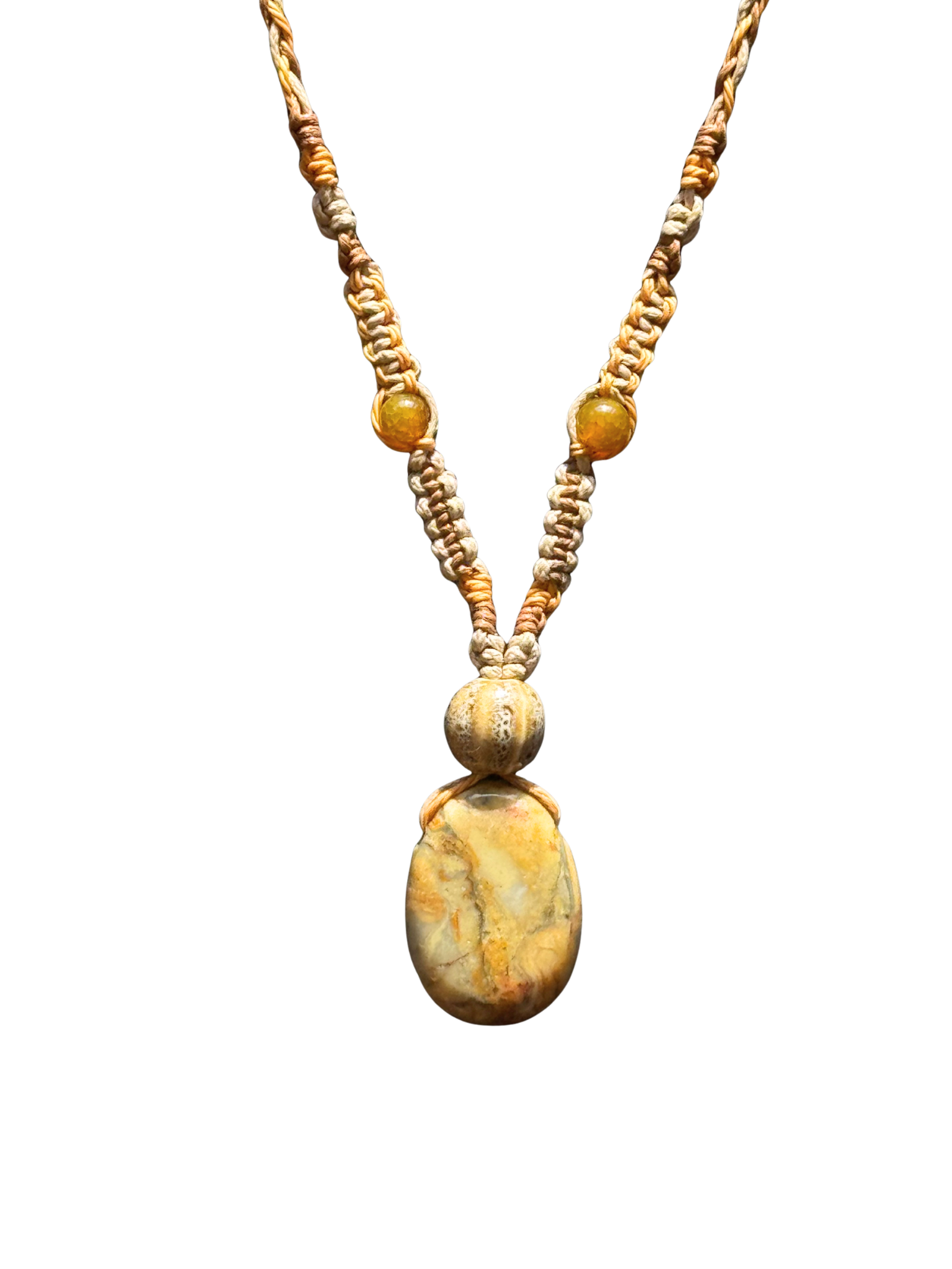 Portez l’énergie joyeuse et protectrice de l’Agate Crazy Lace avec ce collier en macramé tissé à la main.