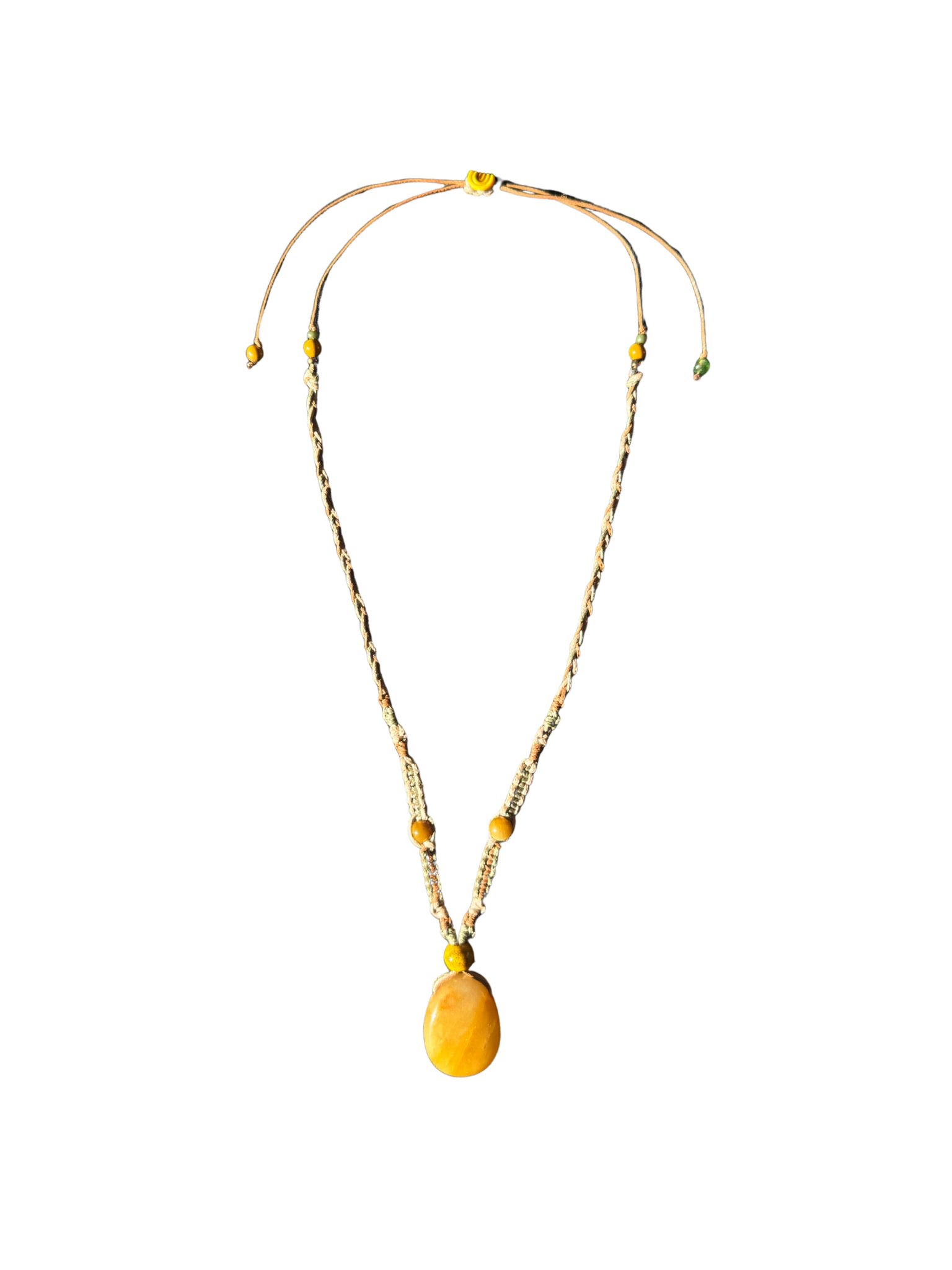 Portez l’éclat solaire de l’Aventurine jaune avec ce collier en macramé tissé à la main.