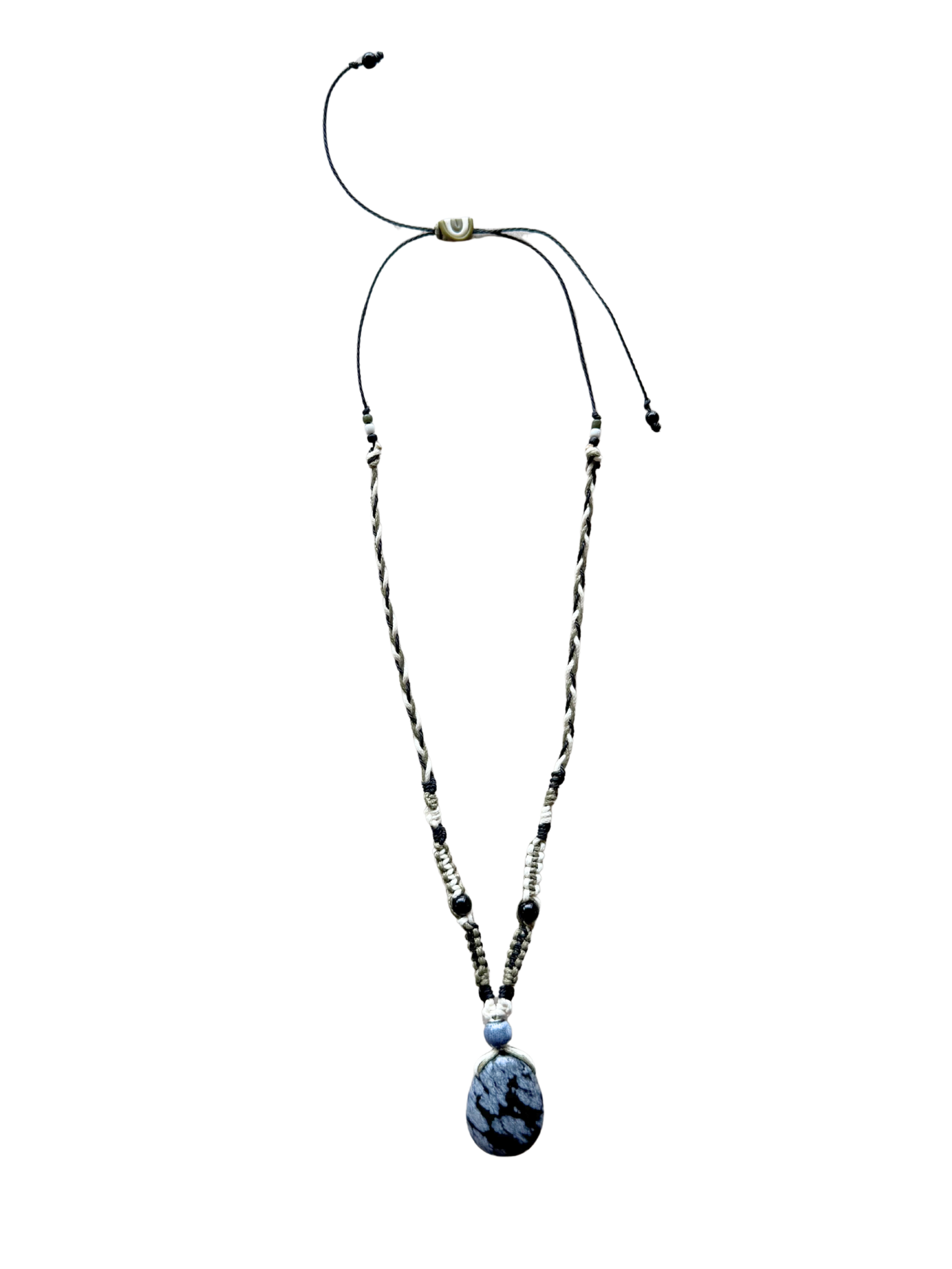 Portez la puissance équilibrante de l’Obsidienne Flocon de Neige avec ce collier en macramé tissé à la main.