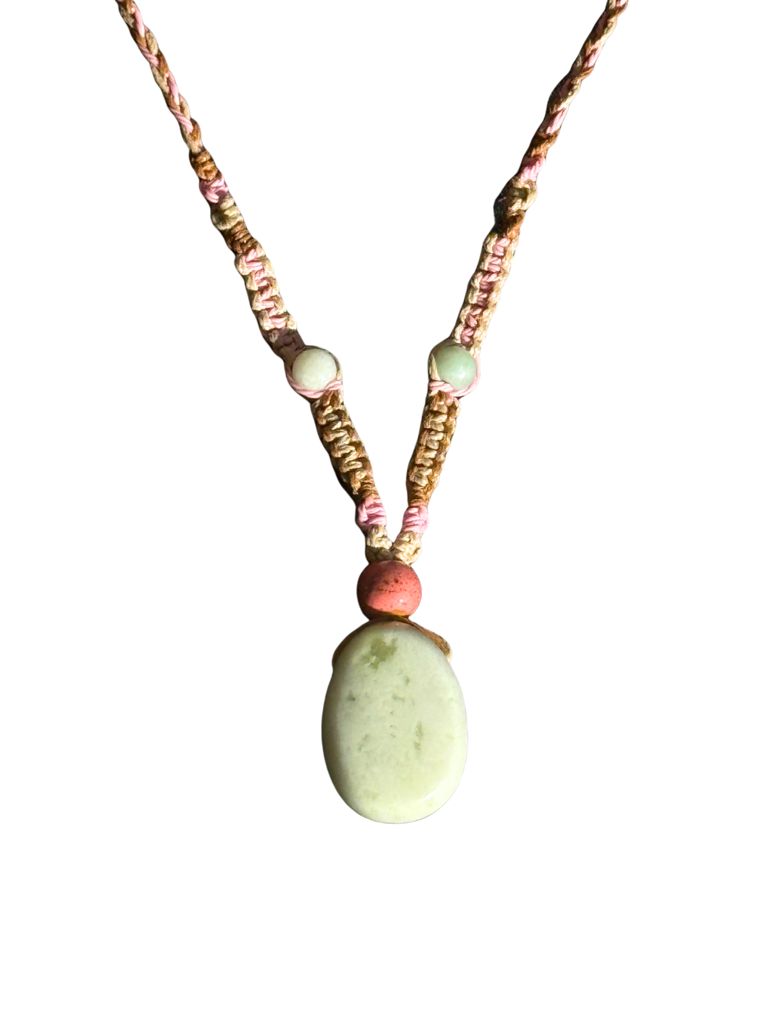 Portez la sérénité du Jade de Hetian avec ce collier en macramé tissé à la main.