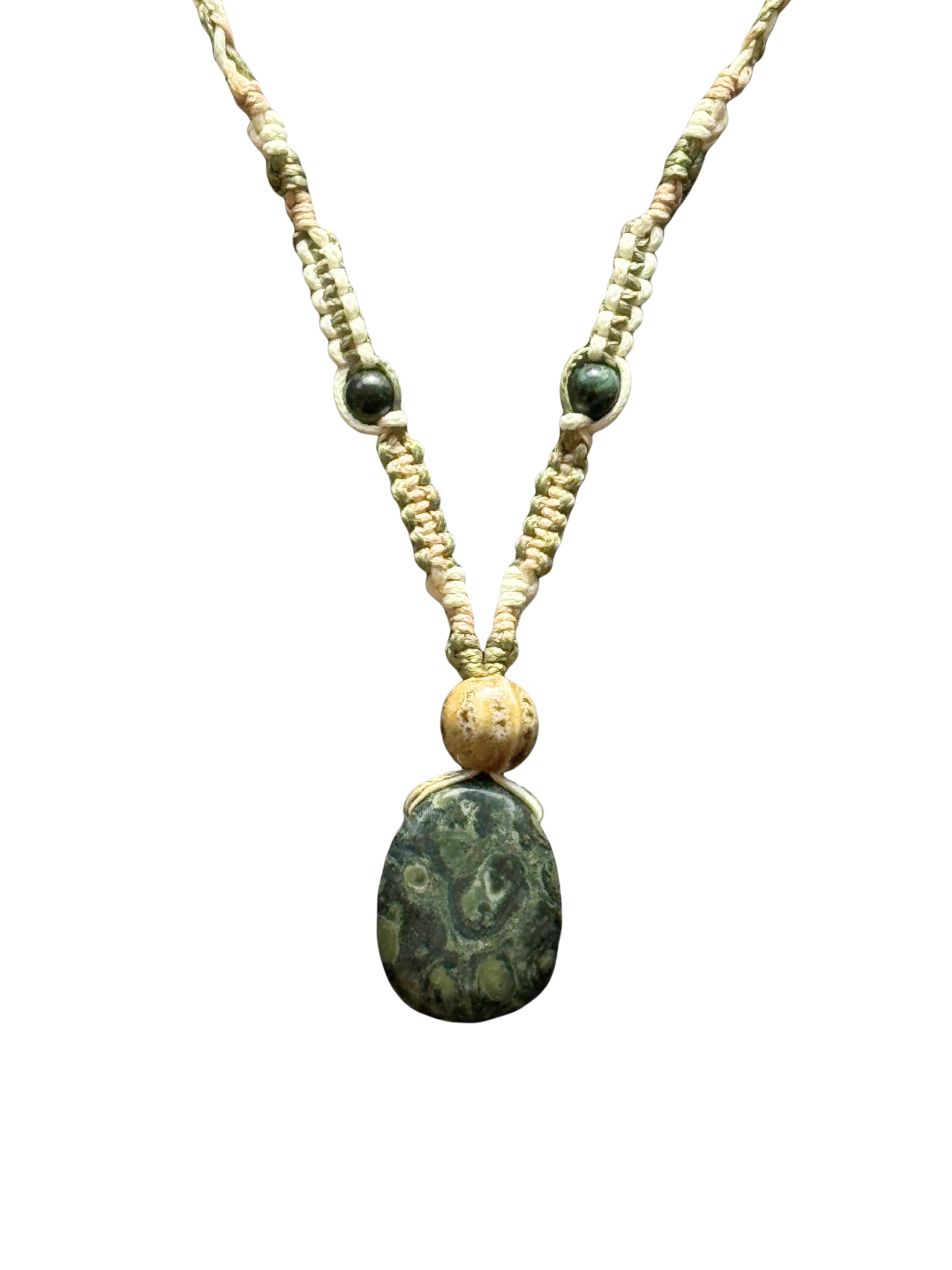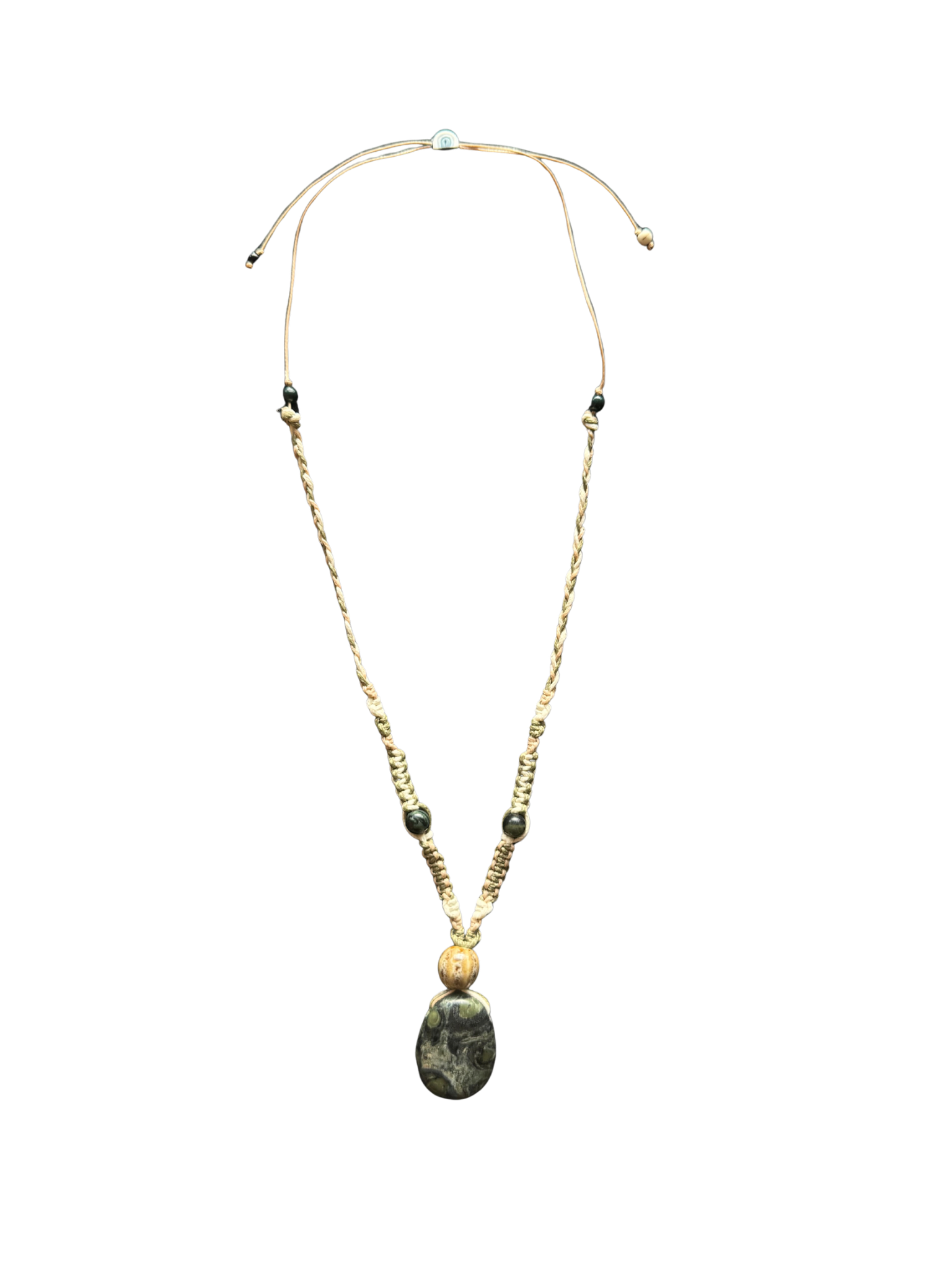 Montée sur un fil de coton naturel ou ciré, et ornée de deux perles d'unakite, cette pièce unique devient un bijou-totem.