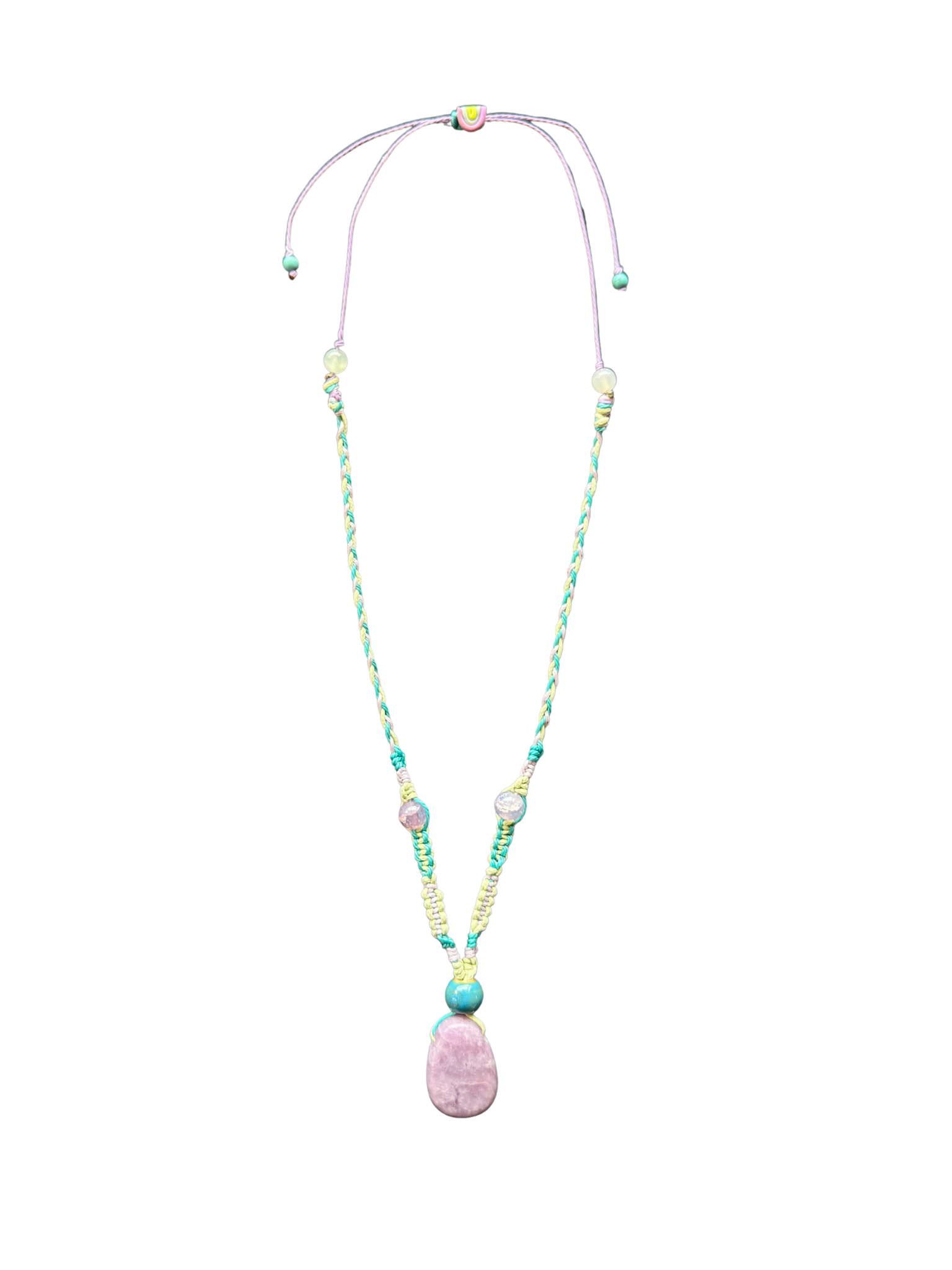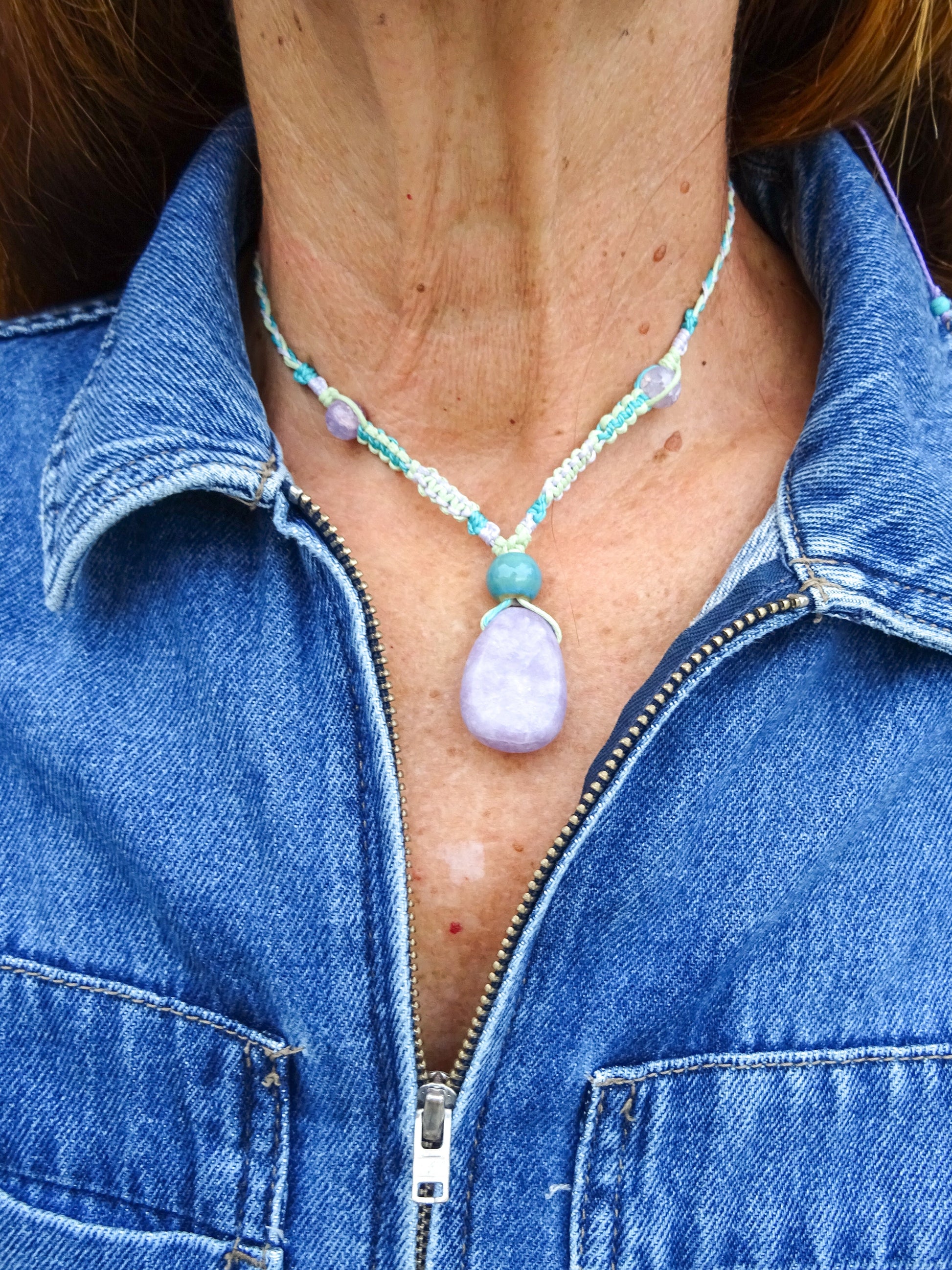Portez la douceur relaxante de la Lépidolite avec ce collier en macramé tissé à la main.