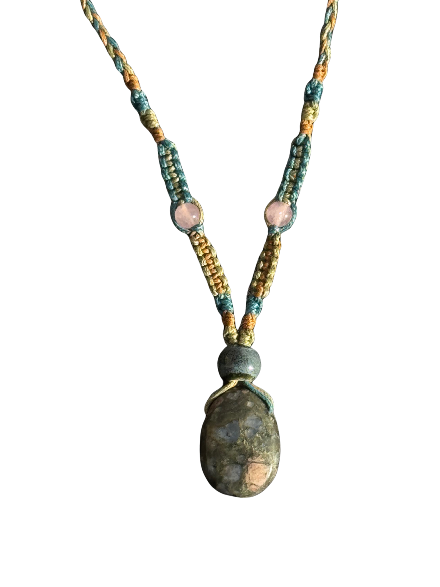 Portez la douceur apaisante de la Libérite Bleue avec ce collier en macramé tissé à la main.