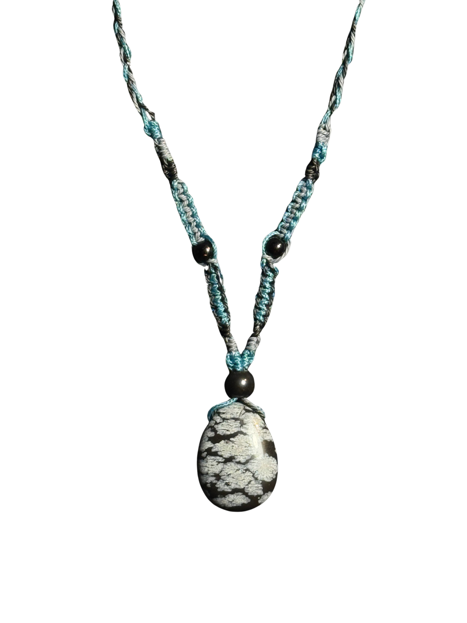 Portez la puissance équilibrante de l’Obsidienne Flocon de Neige avec ce collier en macramé tissé à la main.
