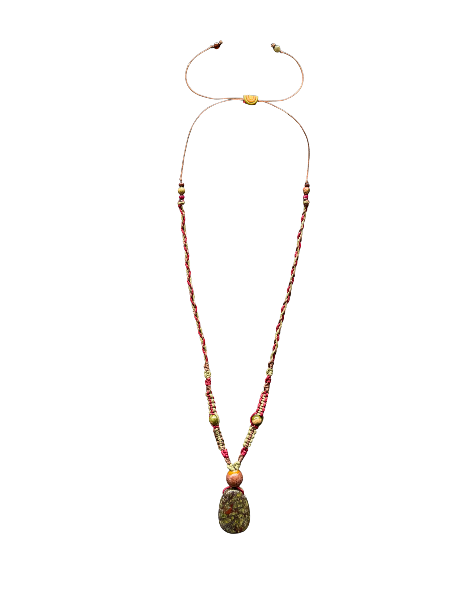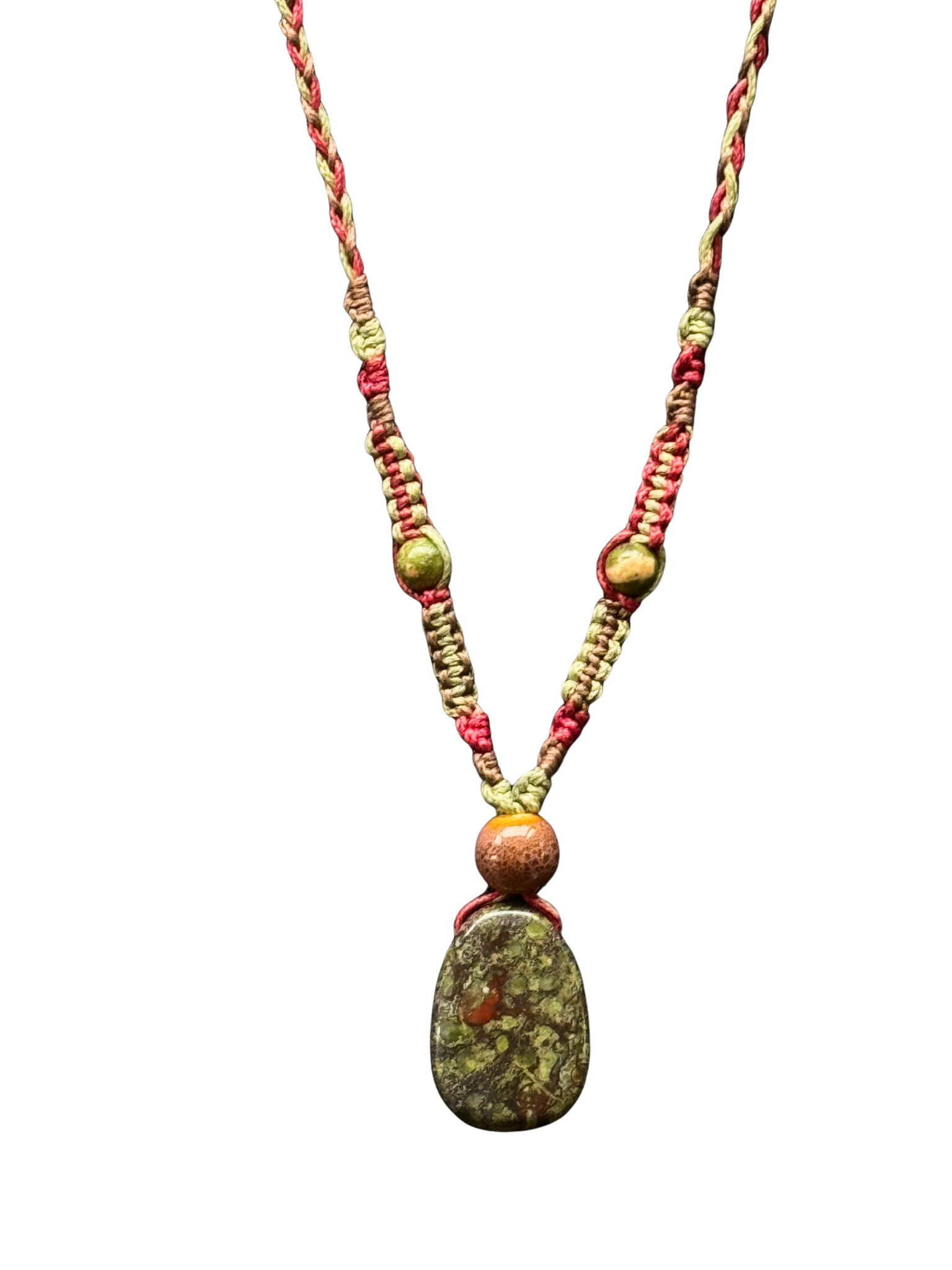Portez l’énergie protectrice et stimulante du Jaspe Sang du Dragon avec ce collier en macramé tissé à la main.
