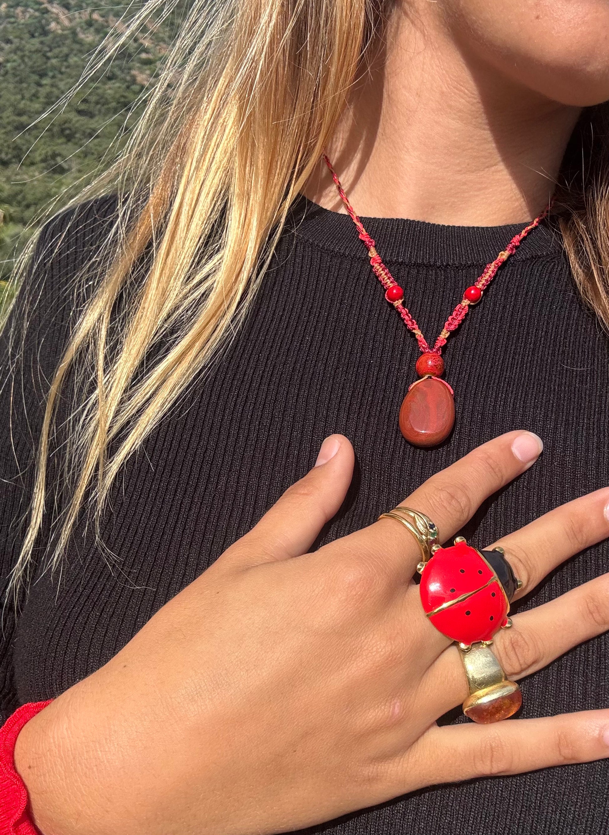 Portez l’énergie vibrante du Jaspe Rouge avec ce collier en macramé tissé à la main.