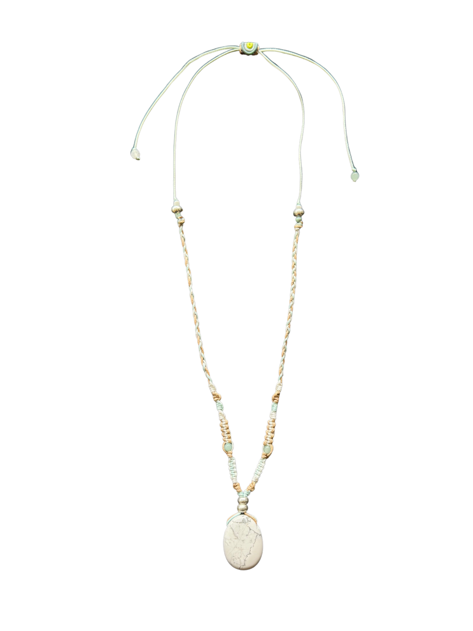 Portez la douceur apaisante de la Howlite Blanche avec ce collier en macramé tissé à la main.
